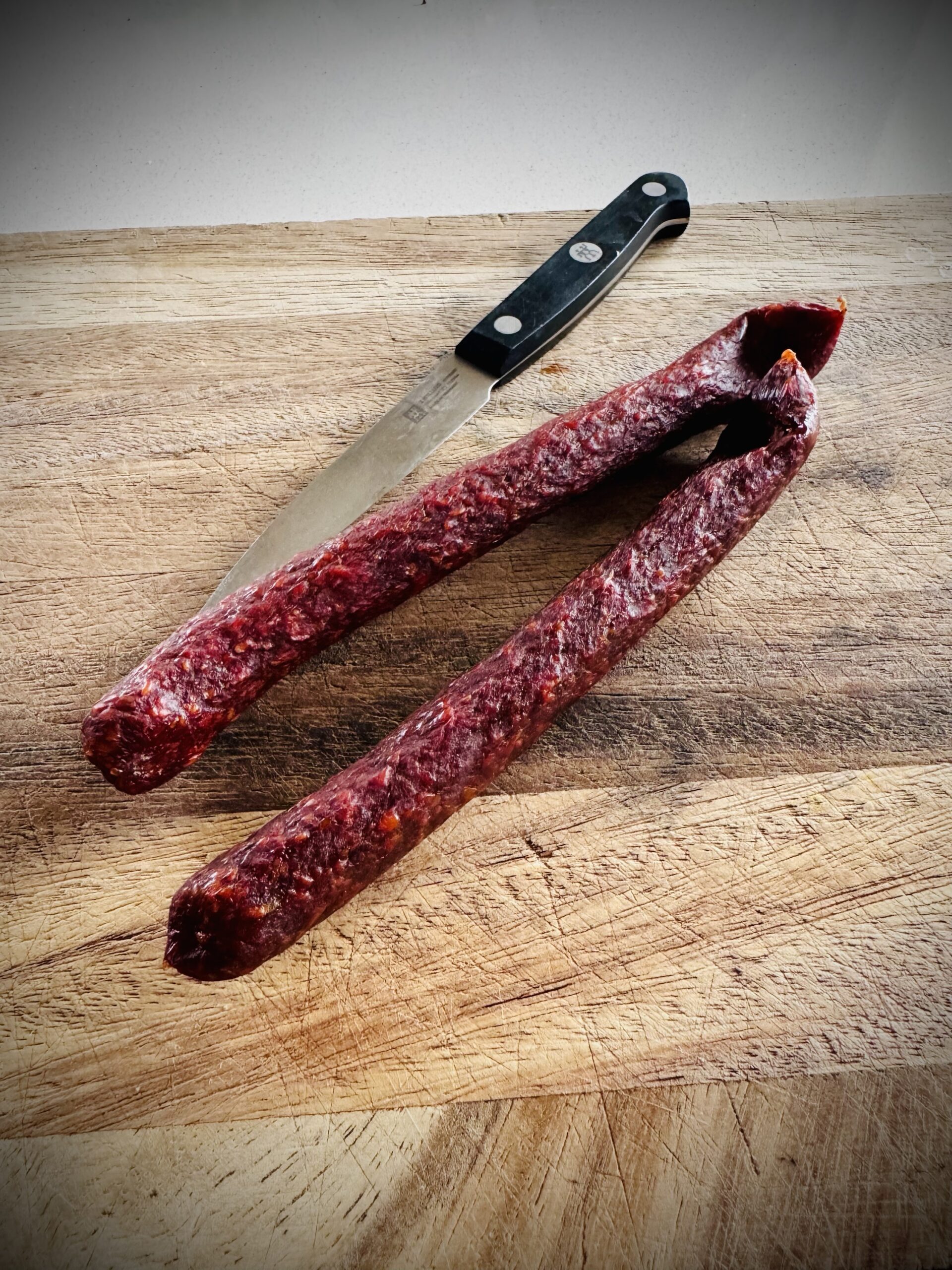 eine lange dünne recht feste Paprika Rohwurst mit mittlerer bis feiner Körnung. Sie ist leicht pikant aber absolut nicht scharf. Milde Würzung.