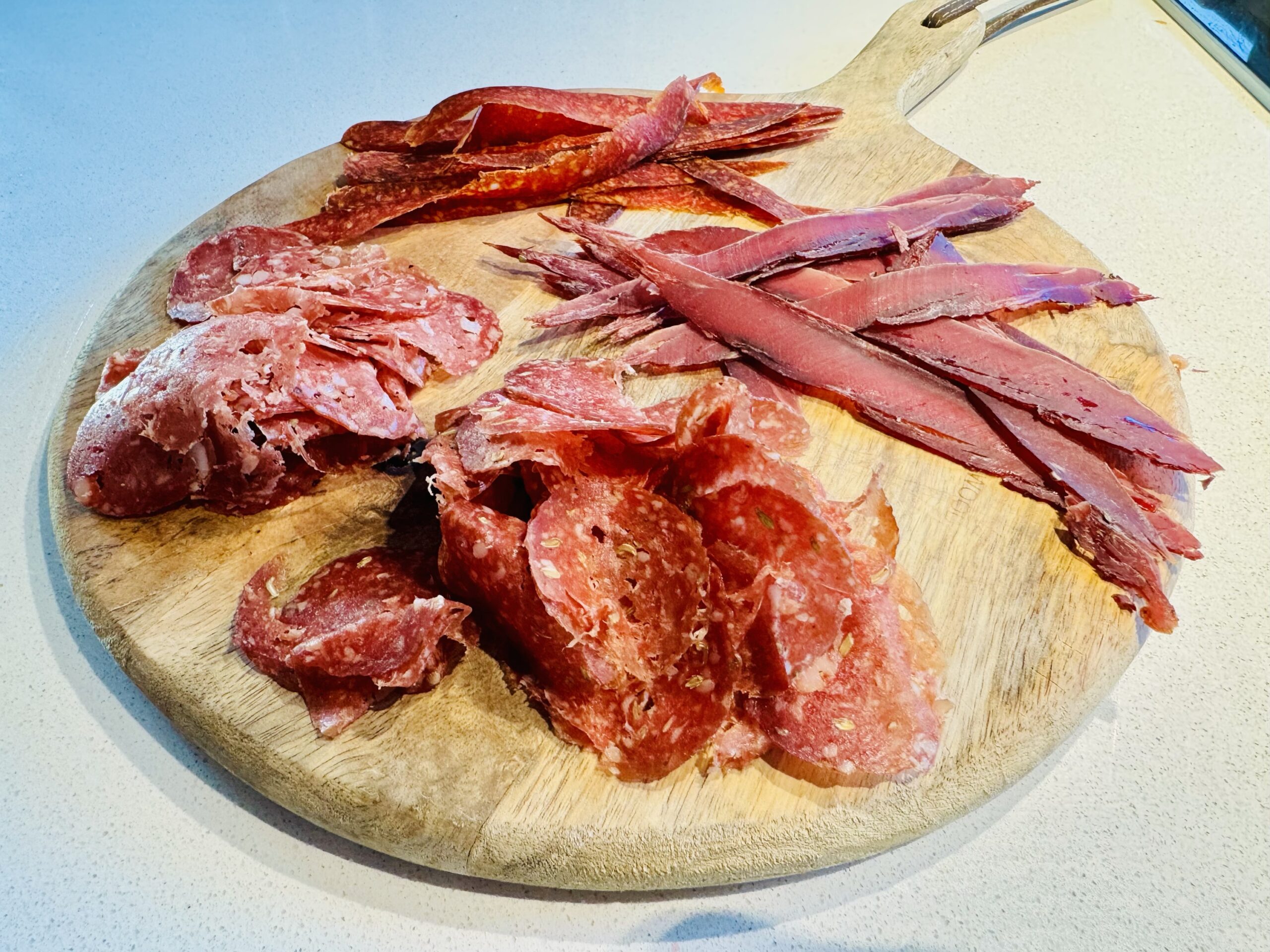 Diese Wildsalami vereint die Ursprünglichkeit regionaler Jagd mit der Würze des Südens. Der Fenchel verleiht der Salami einen markanten, kräftigen Charakter, der besonders gut mit frischem Brot, Oliven und einem Glas Rotwein harmoniert.